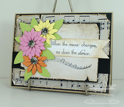 I was inspired to go with neutrals and bring out some color with the AWESOME new Upsy Daisy Die-namics dies. I love these dies!! I especially love the larger leaves, and they make a score line down the center for some dimension. Sweet--I can promise that you'll be seeing them a lot from me. They are my absolute favorite flower dies!!! There's some sweet little dies for cutting out the centers but I decided to pull out my designer thumb tacks to use instead. I just cut off the pin with wire cutters and glue the heads on. I haven't used them in a while but I noticed my stash is getting low so I picked up some more over the weekend. The music swirl under the sentiment is from Inspired By Music. Other MFT products I used are Fossil, Black Licorice, Orange Fizz, Banana Split, Sour Apple, and Cotton Candy card stock, and Take Note digi paper.