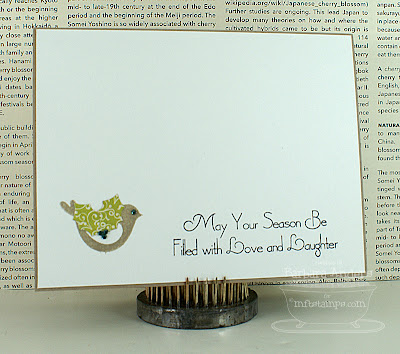 I'm using MFT's hot off the press new release, Clearly Sentimental About Christmas, this month's Triple Scoop set, for my card. I love how peaceful this color palette and these papers are so this was a perfect sentiment for today. Simple layout, but the Layered Label Die-namics dies and the sweet bird from the Homespun Birdhouse Die-namics set just work so well together. I couldn't resist giving the little birdie a holly decoration--the leaf die is from Christmas Ornaments Die-namics set--to sport :)