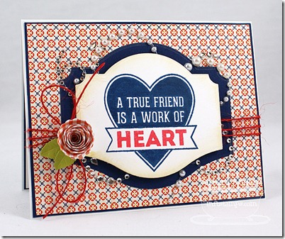 Happily, I had some patterned paper that would work ;-) I’m using the new MFT My Favorite Sentiments set that is selling for only $6 through July 31 to celebrate MFT’s sixth birthday! It’s stamped on a new Die-namics Designer Labels 3 STAX die cut and layered up with another one. A sweet Die-namics Rolled Scallop Flower and Die-namics Royal Leaves finish it off.