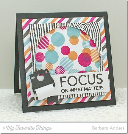 I started with a Steel Gray Card Stock base, cut to 4 1/4” square. Next I popped up a layer of Sweet Tooth Card Stock stamped with an image from Plaid Builder Background and Orange Fizz Ink, Razzle Berry Ink, Berrylicious Ink, and Steel Gray Ink, stamped diagonally. Next is another piece of Sweet Tooth Card Stock stamped with Woodgrain Background and Steel Gray ink with a Circle STAX Set 2 Die-namics window cut out. Through the window is a Bokeh Builder element using the same colors as the striped layer. There’s a lot going on, pattern-wise, so the sentiment is a simple Steel Gray Ink on Sweet Tooth Card Stock, also from Bokeh Builder. A LLD Accent It – Cute Cameras Die-namics cut from Steel Gray Card Stock finishes it off.