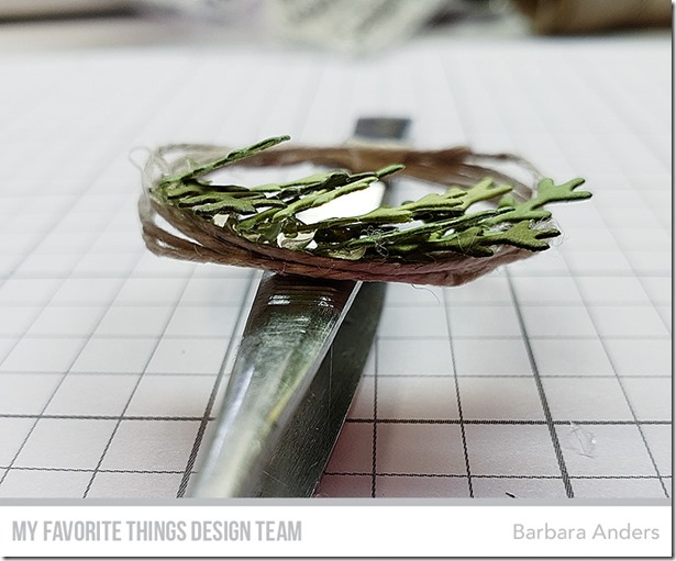 First, here’s what I started with to create my wreath: Hemp Cord and three shades of green card stock cut with the snowflake from Filled with Joy Die-namics. I created the base by curling up some hemp cord to simulate a “grapevine wreath”. I secured the ends with hot glue but you can use any quick setting glue you have.