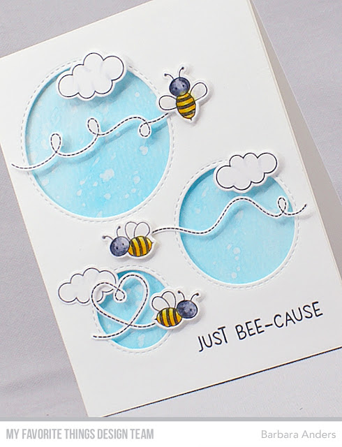 I used this sketch to create three mini scenes using Meant to Bee Stamp Set and Die-namics. The circles were cut with Inside & Out Stitched Circle STAX, watercolored backgrounds, and flight trails for the horizontal elements.
