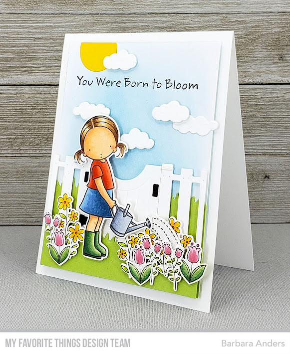 Isn't she adorable??  I wonder if she'll come work in my garden? For this card, I began by stamping the images (the flowers are from BB Spring Gnomes) on No Line Coloring card stock with Extreme Black hybrid ink, cut them out with the coordinating Die-namics, and colored them with Copic markers.